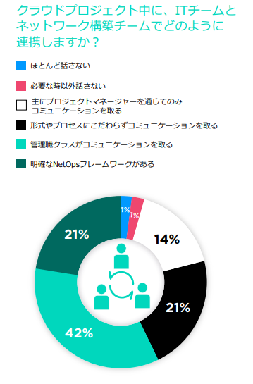 チーム間のコラボレーションは成功に不可欠ですが、多くの組織はまだすべての適切なチームを関与させていませ ん。組織の3分の1以上(35%)は、情報セキュリティを含んでおらず、ビジネスを大きなリスクにさらす可能性があります。またほぼ半数(42%)は、ネットワークチームを含んでおらず、不安定なインフラと移行の失敗につながる可能性があります。