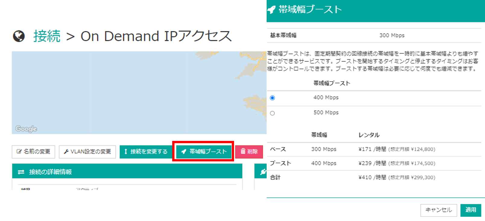On Demand上の接続済み回線は、「接続の変更」オプションを使用することで、契約帯域の増速が可能です。この際、増速の上限は、ポートの帯域までとなります。接続の増速はご利用中の契約期間及び新規契約に適応されます。
